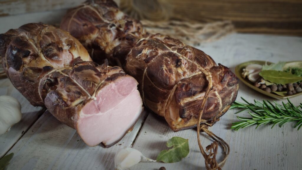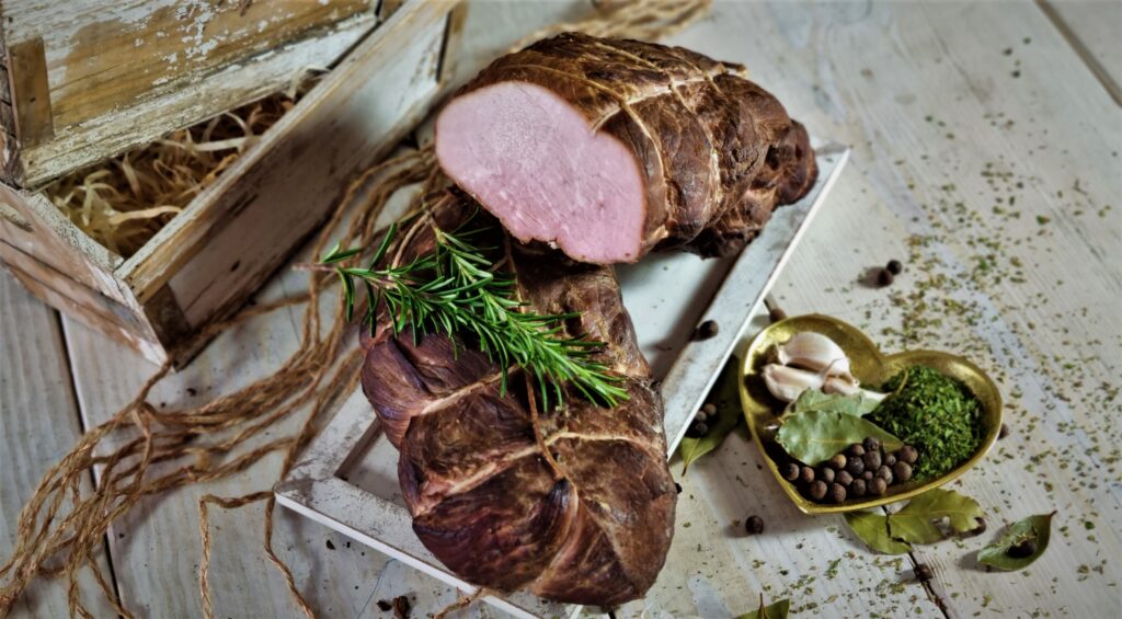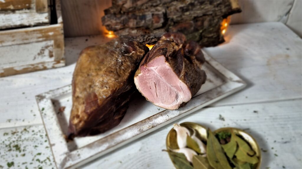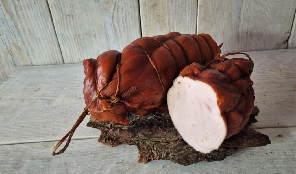 Sekret smaku jest niezwykle prosty , by ją stworzyć potrzebny jest czas i ręka naszego Mistrza Masarstwa. Odpowiednio wyselekcjonowane mięso trafia na 7 dni do zalewy by tam chłonąc naturalne przyprawy. Po tym czasie Szynka jest ręcznie wędzarniczą i trafia do wędzarni ceglanej na 4 godzin gdzie uzyskuje piękny kolor podczas wędzenia na drewnie bukowo – olchowym. Po tym procesie jeszcze parzenie, chłodzenie i ostatni etap pakowanie by świeża trafiła na Wasze stoły. W roku 2018 została wyróżniona za wyjątkowe walory smakowe nagrodą specjalną przez Kapitułę Programu certyfikującego „Smaczne bo Podkarpackie” Znajdziecie państwo nasz Królową w paczkach : „ Wędzone Tradycyjnie”, „ Upominek Wyśmienity”, „Biesiadnicy”