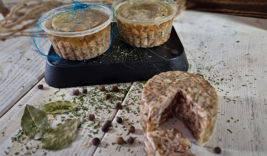 Galaretka Drobiowa wytwarzana jest domowym sposobem z ćwiartek z kurczaka. Dzięki gotowaniu (przez kilka godzin) uzyskujemy wywar który jest bardzo dobrym źródłem kolagenu. W przekroju możecie Państwo dostrzec , że od góry do dołu jest wypełniona mięsem. Nie tylko świetnie smakuje ale również pięknie prezentuje się na stołach. Znajdziecie ten produkt w paczce : ” Dla Wielbicieli Drobiu”