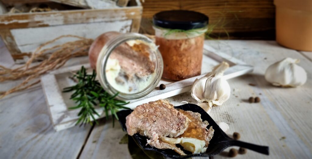Dla wielbicieli dawnych smaków zamknęliśmy w słoiku kiełbasę wiejską. Zawartość słoika jest niezwykle prosta to mięso,sól, świeży czosnek i cukier. Umiejętności masarskie pozwoliły nam stworzyć idealnie dobraną kompozycje smakową by zachwycić Państwa wyśmienitą galaretką, i pysznym mięskiem w jednym.Po otwarciu zobaczycie Państwo biały tłuszczyk i lekko szare mięso na górze słoika, kolor szary wynika z braku dodawania peklosoli. Jesteśmy przekonani , że ten produkt zagości w Państwa domach na zawsze. Produkt ten znajdziecie Państwo w paczce :” Biesiadnicy”, oraz „Stół dla Czworga”